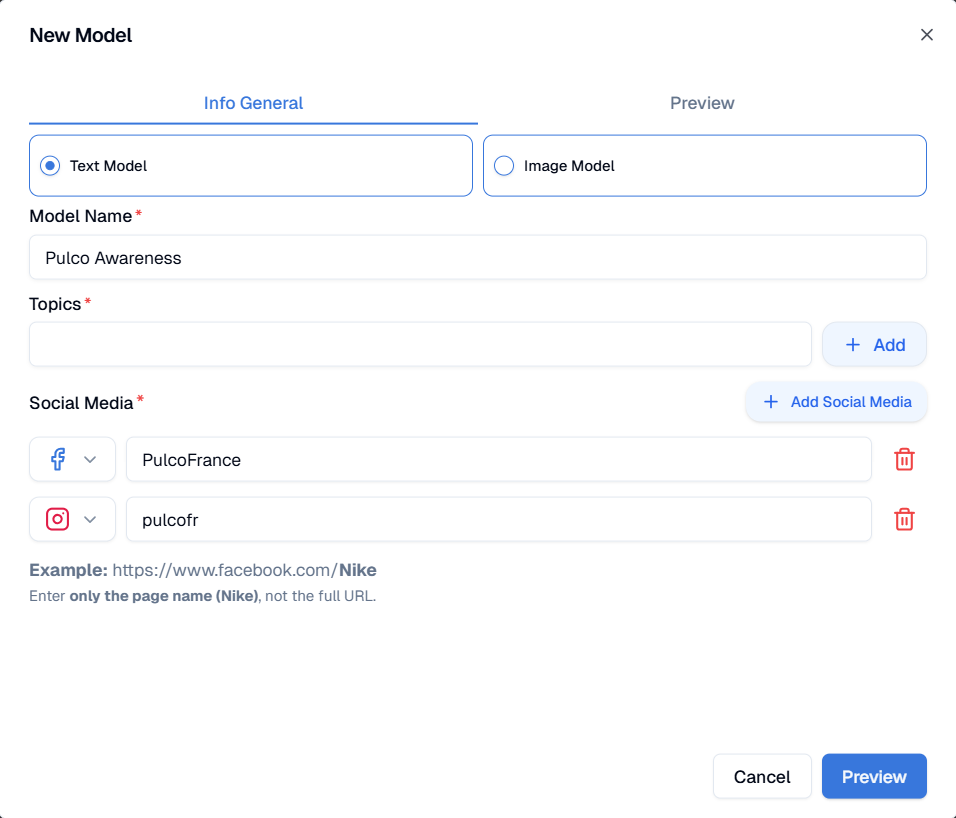 Creating an LLM (Language Learning Model) private model on the Kwore platform allows you to reproduce your brand's tone of voice and communication style or mimic a desired communication style. This guide will walk you through the step-by-step process of building a private model based on your social media data to generate brand-consistent content.