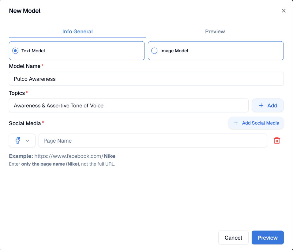 - Select the Type of model (e.g., Text Model - Style or Tone of Voice).