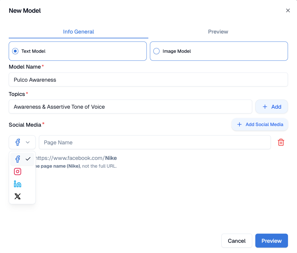 Creating an LLM (Language Learning Model) private model on the Kwore platform allows you to reproduce your brand's tone of voice and communication style or mimic a desired communication style. This guide will walk you through the step-by-step process of building a private model based on your social media data to generate brand-consistent content.
